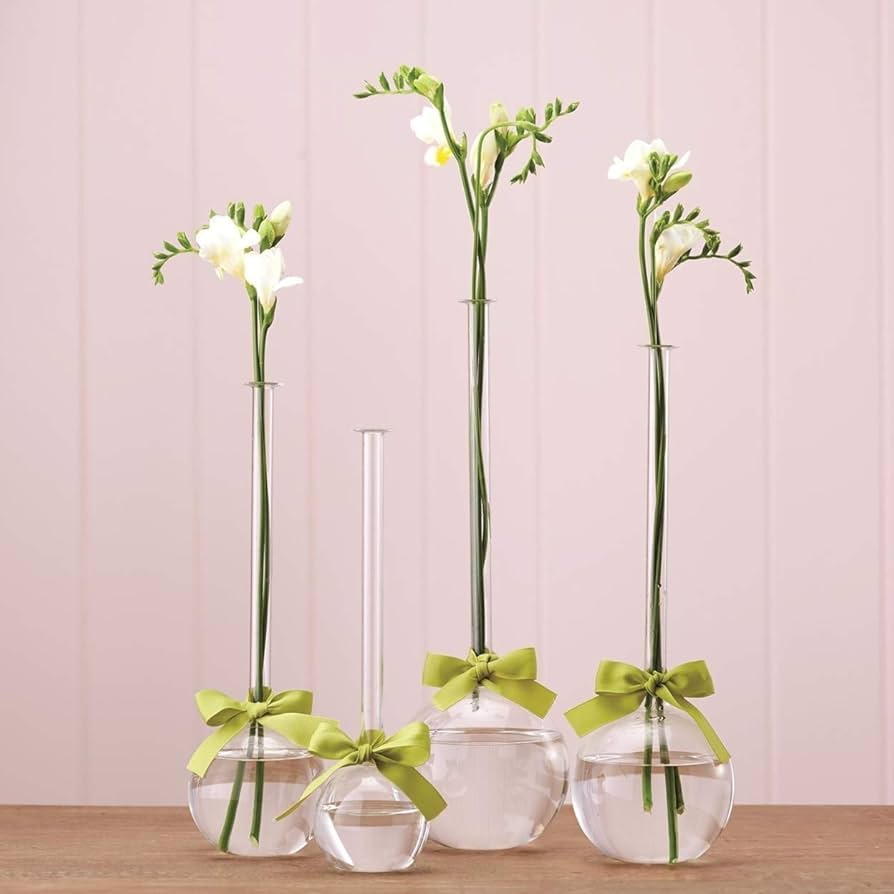 Like little gifts sprouting a flower or greenery, this set of four designs is made from hand-blown glass. Unlike traditional vases, the stunning designs feature a unique green ribbon detail that can be updated to fit any look or dècor. *individually sold