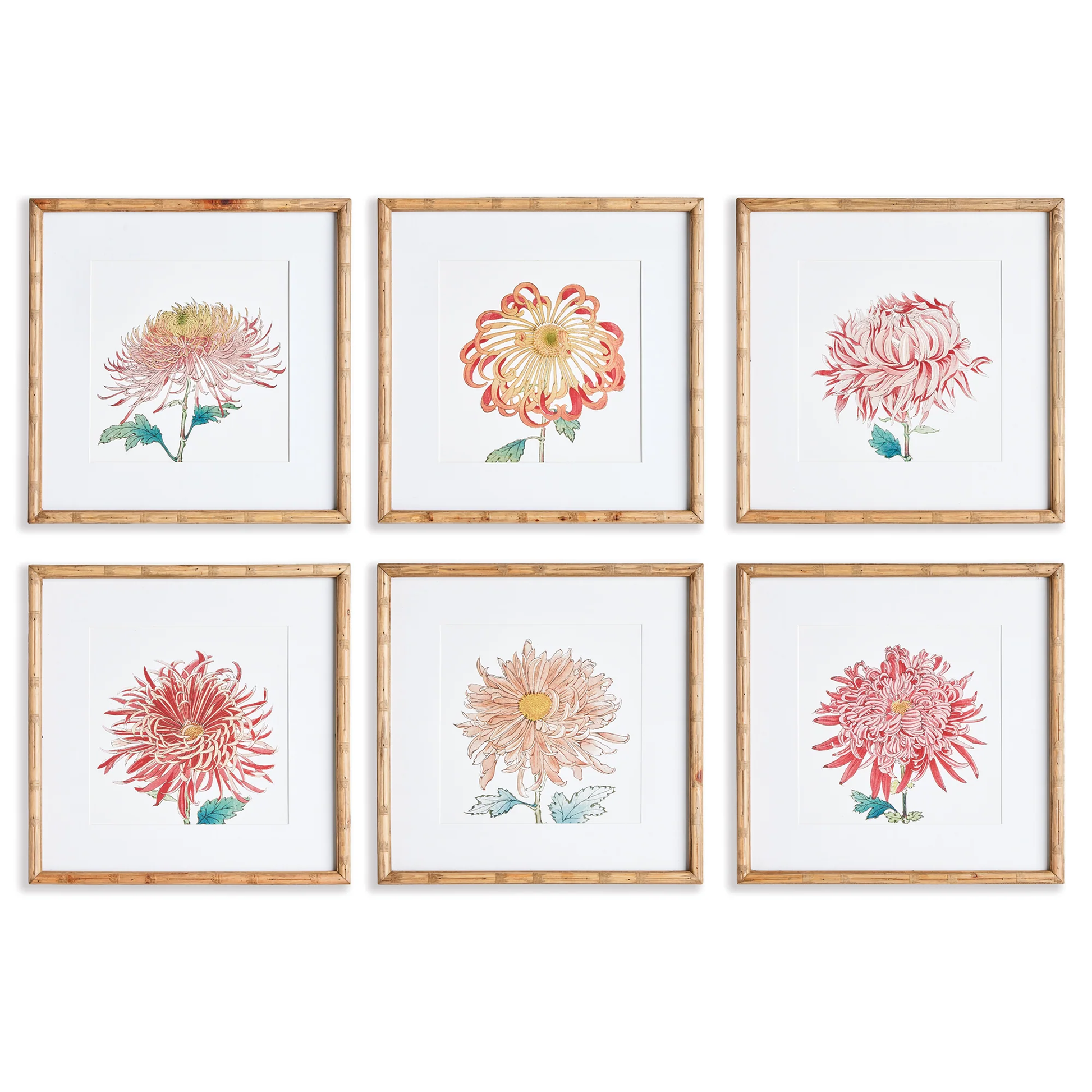 From a soft blush to a deep magenta, this set of colorful chrysanthemum illustrations are a vibrant bunch. Finished off with a mat and faux bamboo frame, they add a feminine pop of color to powder room, kitchen or study.