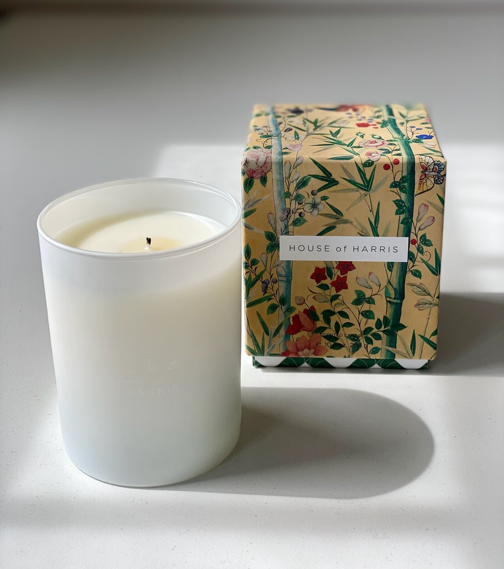 The new candle box packs a punch, featuring two iconic House of Harris wallpapers (Bamboo Garden & Park), while the vessel itself — a white matte glass candle — provides a sleek, minimalistic look that fits seamlessly into any space.