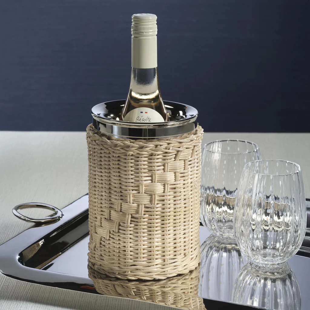 Elevate your entertaining with The Palmier Wine / Champagne Bucket, expertly crafted from woven rattan and stainless steel. This elegant piece combines natural texture with sleek durability, keeping your beverages chilled while adding a refined touch to any setting. Perfect for sophisticated gatherings, it blends timeless style with practical function.